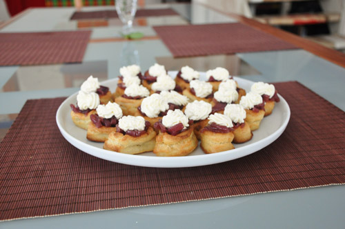 Тарталетки со свежим сыром и луковым конфитюром ![]() Надо: Слоёное бездрожжевое тесто- 250 г Творожный/ свежий сыр- 150 г Луковый конфитюр Приготовление: Расскатайте размороженное слоёное тесто до толщины в несколько мм. Вырежьте из теста квадратики (со с тороной 4 см) , из обрезков теста сделайте бортики (толщиной 0,5 см). ![]() Выпекать в разогретой до 200 гр.Ц духовке 10-15 мин. Вынуть из духовки и остудить. Выложить внутрь тарталеток по ½ ч.л. лукового кнофитюра и сверху выдавить с помошью кондитерского шприца/ мешка творожный или свежий сыр. При подаче можно украсить цедрой апельсина. |