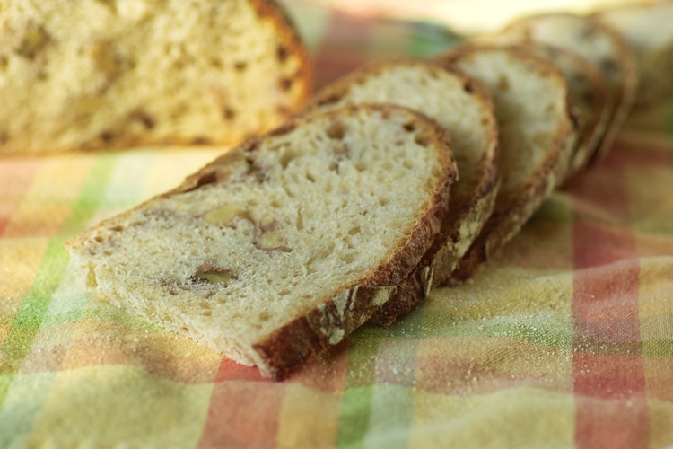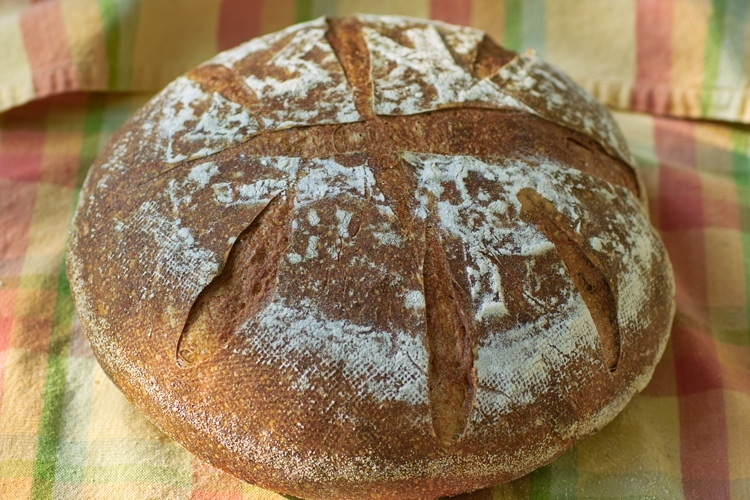 Хлеб с грецкими орехами на закваске ![]() Для этого хлеба нам понадобится 15-20г* рабочей закваски. Рабочая закваска: Пшеничную закваску подкормить по схеме два раза. От образовавшейся смеси отмерить 15-20г* и с ними продолжать работать. * время зависит от силы закваски. Если у вас она молодая, то может потребоваться большее количество и время созревания будет дольше. Следующий этап это опара: Опара 15-20г рабочей закваски 45г теплой воды 75г белой хлебной муки Развести закваску в теплой воде, добавить муку, размешать и замесить тесто. Тесто сначала довольно плотное, по мере вымешивания станет эластичным. Закрыть крышкой или пленкой и оставить подходить на 8-12 часов или пока не увеличится в размере в четыре раза и будет опускаться при лёгком нажатии на него. Тесто опара 250г белой хлебной муки 250г обычной муки 50г цельнозерновой муки (можно, как я, заменить cпeльтой) 50г светлой ржаной муки (medium rye) 390г теплой воды 15г соли 135г грецких орехов 265г изюма* (факультативно) Приготовление теста: 1. Отмерить и просеять муку в одну большую емкость. Добавить воду, хорошо размешать, прикрыть пленкой и дать постять минут 20-30. 2. Добавить к тесту опару и размешать. Замесить в течение минут 10 тесто. В конце добвать соль. Тесто должно получиться плотным и однородным, прятным на ощупь. Добавить орехи и изюм и все вместе еще немного вымесить, чтобы орехи и изюм хорошо перемешались в тесте. 3. Выложить тесто в большую емкость, плотно накрыть пищевой пленкой и дать ему хорошо подойти в течение 4-5 часов, не обязательно вдвое, но чтобы оно хорошо выросло и покрылось пузырьками воздуха. В середине (примерно через 1 час), перевернуть тесто один раз. Переворот теста: Используя достаточное количество муки, посыпать рабочую поверхность, руки тоже пересыпать мукой и вынуть тесто из миски, выложить на разделочную доску, немного расправить руками в виде квадрата и, начиная справа к центру, завернуть, потом сверху к центру, затем завернуть слева к центру и снизу к центру. Далее его уложить швом книзу, прикрыть пленкой и дать подойти опять. ![]() 4. Хорошо подошедшее тесто ( в два раза оно у меня не выросло, где-то в полтора увеличилось и было очень мягкое и с пузырьками) вынуть из емкости, перенести на присыпанную мукой поверхность, сформировать шар, прикрыть пленкой и дать постоять минут 15. В это время присыпать корзинку, в которой тесто будет подходить, мукой. если такой корзинки нет, можно взять большой дуршлаг, застелить его льняным полотенцем и присыпать мукой. 5. Сформировать из теста ровный шар. Хорошо прикрыть пленкой и поставить подходить в теплое место до увеличения вдвое, примерно часа на 3. 6. Минут за 45 до начала выпечки, нагрейть плиту до 425Ф(220Ц). Не забудьте положить камень для выпечки, если у вас есть. Если нет, то можно использовать противень. 7. Подошедшее тесто переверните на лопатку для выпечки или на пергаментную бумагу. Сделайте надрезы в виде параллельных линий, расстояние одной от другой примерно 2 см. Глубина надрезов должна быть около 7мм(если сделать надрезы глубже, то можно нарушить сетку из клейковины, которая образовалась во время подхода, это приведёт к тому, что хлеб опадёт в духовке). Перед началом выпечки быстро (чтобы духовка не остывала) обрызгайте духовку из пульверизатора водой и поместите в нее хлеб. 8. Выпекайте хлеб 40-45 минут или пока хлеб на станет золотисто- коричнев