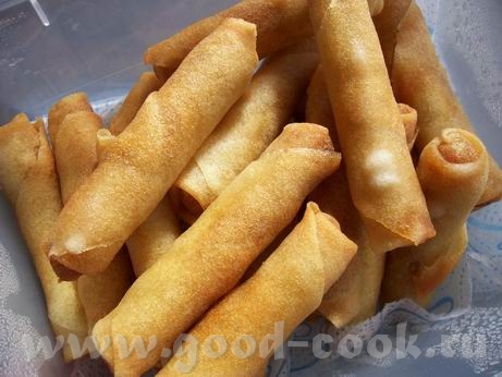 даже в википедии 2 слова про НИХ вобщем китайское нечто с разными начинками. у меня с земняками, я к ним люблю кисло-сладкий соус, но не было в этот раз. так что так, в сухомятку пошли что именно за тесто - я не знаю! пробовала однажды дома делать с фило - не то получилось вы кушайте! оно фкусненько, хрустить |
