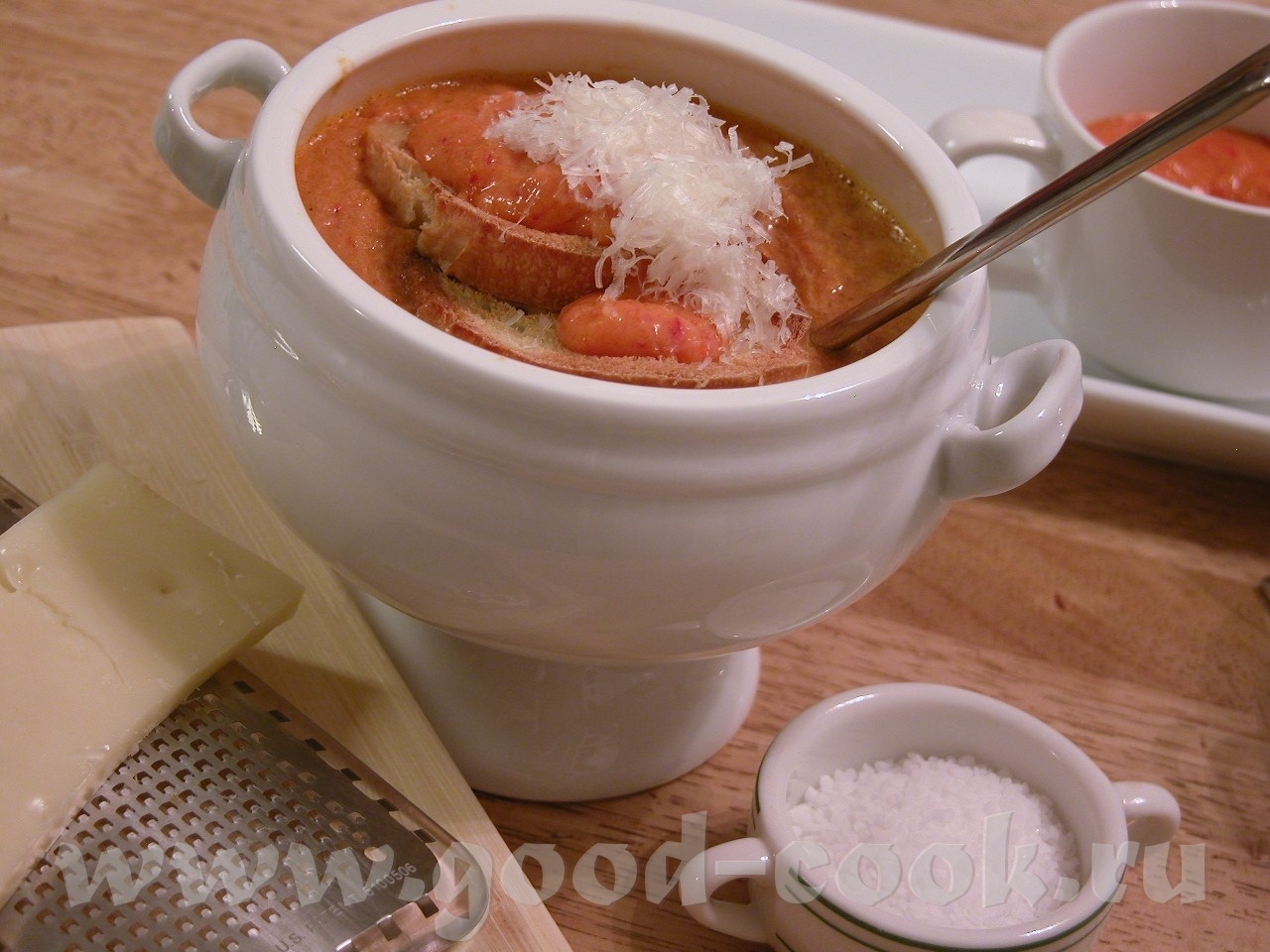 Рецепт очень простой, но конечный результат производит впечатление, что на кухне Вы провели по меньшей мере пол дня. 1 кг рыбы (смесь, поодйдёт любая плотная. У меня были коорлевская рыба, лосось, треска, тунец) 2 ст л оливкового масла (я предпочитаю с сильным вкусом, но ето на любителаы) 1 луковица (мелко нарезать) 1 морковка, нарезать 1 лук-порей (только белая часть, нарезать) 2 больших спелых помидора (нарезать) 1 красный перец (очистить от семян, плодоножки, нарезать) 2 дольки чеснока 1 "bouquet garni" - 3 стебля сельдерея, 3 лавровых листа, 3 ветки петрушки 3/4 ч томатной пасты 1.25 ч сухого белого вина Для соуса 2 дольки чеснока 1 ч л крупной соли (мне понадобилось больше) 1 толстый ломоть белого хлеба без корок (вымочить и отжать) 1 острый красный перец 3 ст л оливкового масла Для подачи Тоасты из багета 2 унции сыра "Gruy[e]re" (на мой взгляд очень похож на хороший Российский, запросто можно заменить) Нагреть в кастрюле масло. Добавить нарезанную на куски рыбу и овощи. Помешивая тушить до изменения цвета. Залить холодной водой, на 1-2 пальца выше содержимого, добавить "bouquet garni" и томатную пасту. Довести почти до кипения, снизить огонь и варить на слабом (очень слабом) кипении 1 час. В ето время сделать соус. В пестике разбить чеснок с солью в пасту. Добавить хлеб, перец и опять разбить в пасту. Или... положить ето всё в блендер и прокрутить до более-менее пасты. Понемногу добавлять оливковое масло, продолжая взбивать. В итоге должен получится гладкий блестящий соус, похожий на майонез. Кстати, соус вполне заслуживает упоминания, как отдельный рецепт. ![]() Вынуть "bouquet garni" и выбросить. Спюрировать суп, добавить вино и прогреть (если слишком густо - добавить кипятка(!)) но не кипятить. Разлить в тарелки, сверху в каждую положить 2 тоаста, 2 ложечки соуса и натёртый сыр. ![]() |