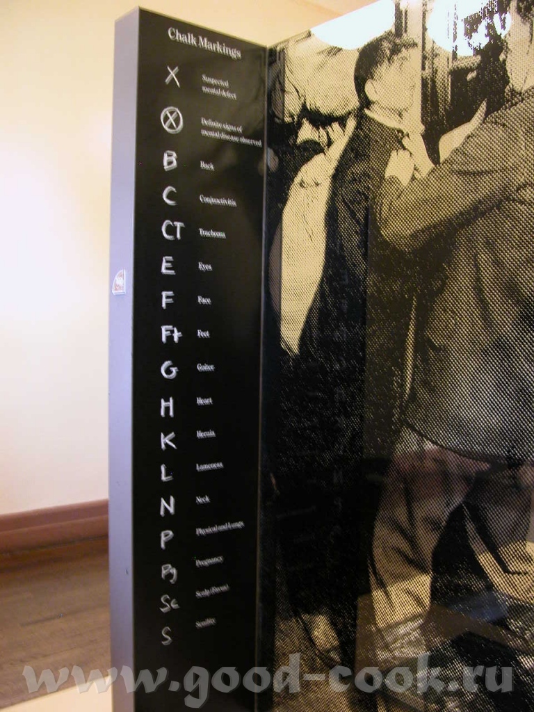 Здесь перечислены пометки, которые врачи мелом ставили на одежде обследуемых. ![]() Бол-во из них - обозначение болезней. Если болезнь поддавалась в то время лечению, то человек помещался в госпиталь, его здания видны из окна регистрационной комнаты. Там он осдержалсы и лечился до того момента, пока врачи не находили, что он может быть "выпущен". Всё ето шло за средства пароходной компании. ![]() ![]() Вторым рядом зданий (их не видно) были здания "карантина" в нём содержались люди, чьи болезни не поддавались лечению и были нежалательны в стране (имеются в виду болезни, которые ставили бы их на носителя в ситуацию, когда он может жить только на гос.дотацию). Очень пристальное внимание уделялось осмотру глаз. Трахома - лидирующая причина слепоты в мире и на сегодняшний день, её носители не имели никакого шанса. Так же психические больные, люди с криминальным прошлым, коммунисты, боевики... |