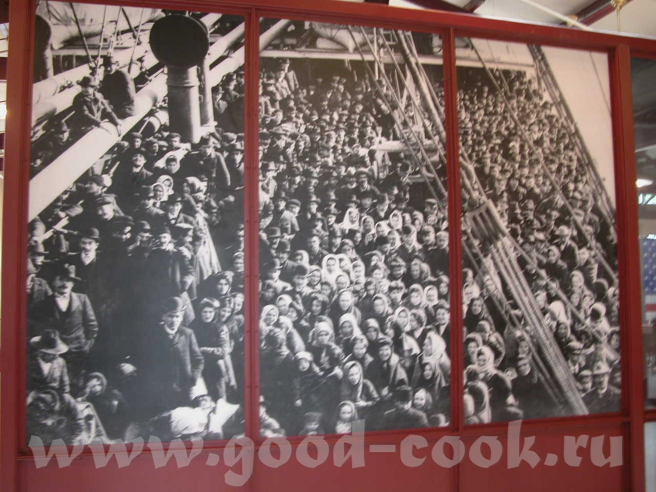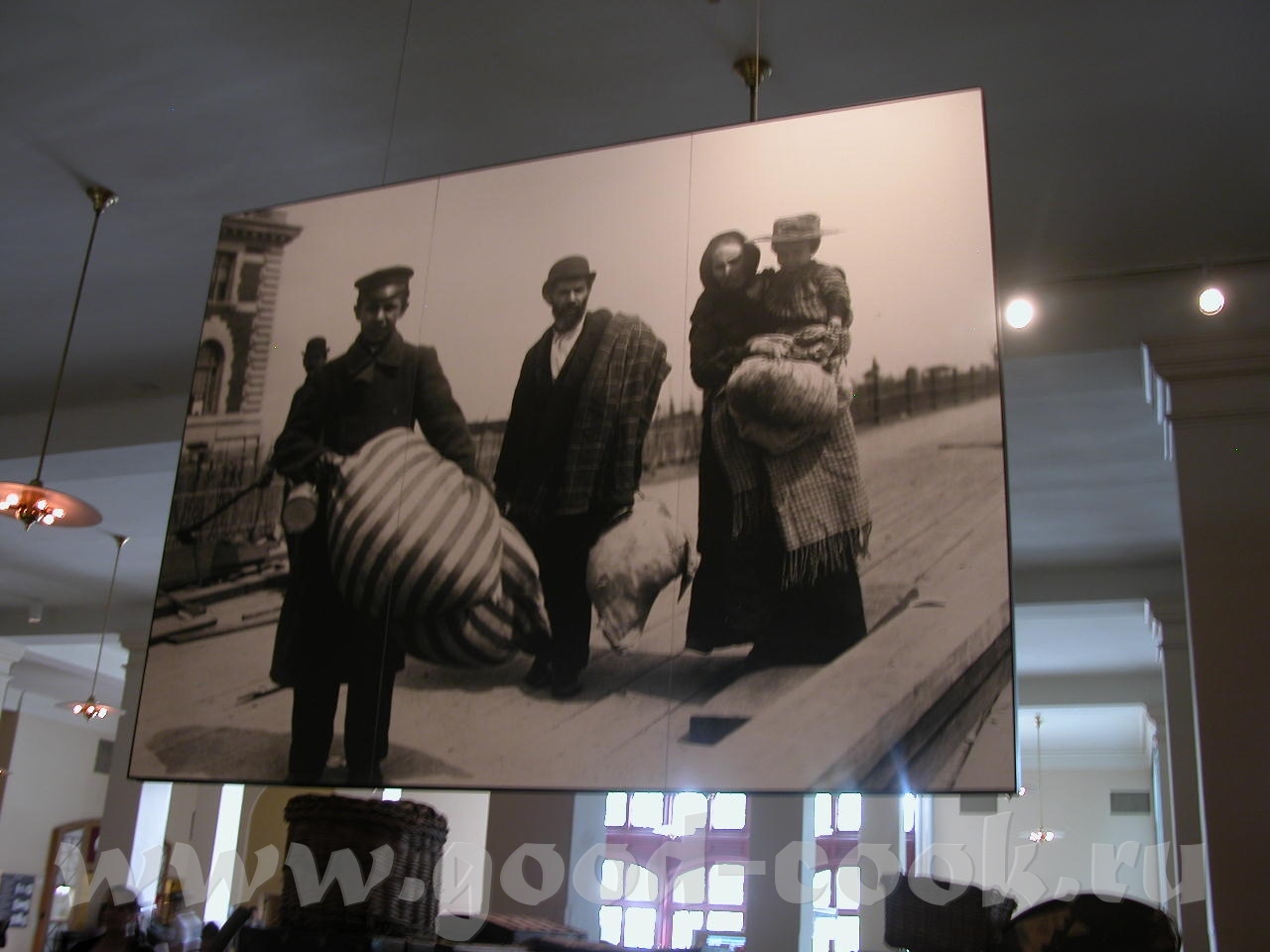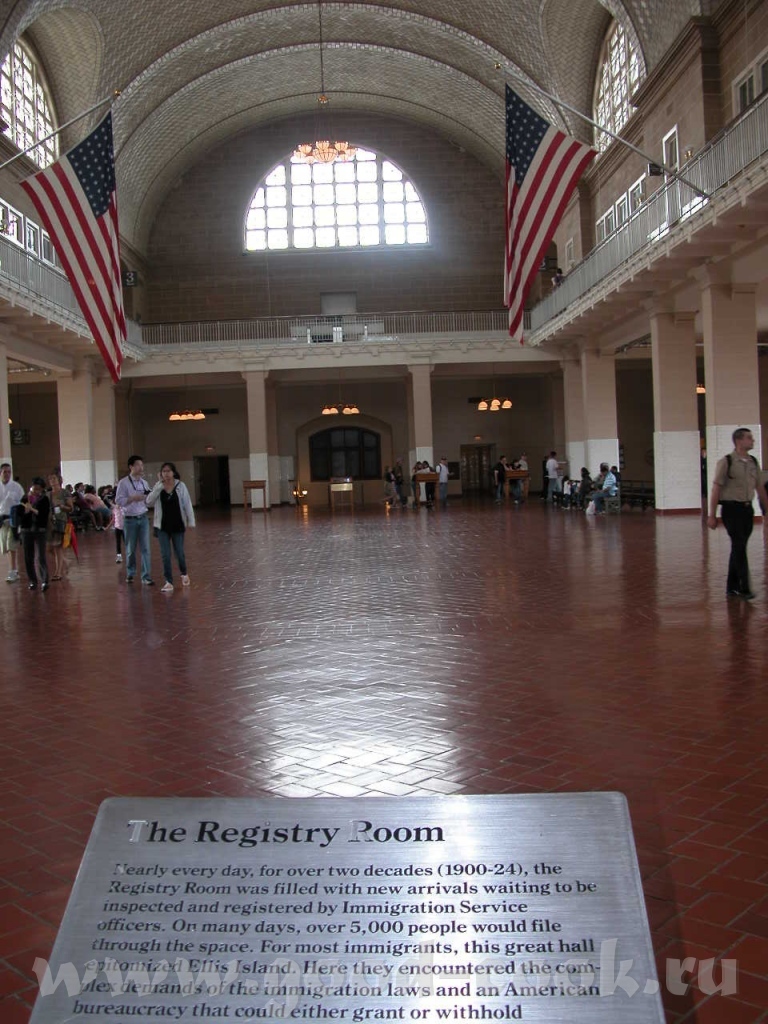 Вернитесь опять к фотографии регистрационной комнаты. После врачебного осмотра было собеседование. При посадке на пароход человек заполнял вопросник из 20 с чем-то вопросов. Сейчас етот листок был в руках клерка, который задавал практически те же вопросы и сверял с данными ранее ответами. В глубине зала видны три двери. "Место слёз". В средню и правую (кажется) направлялись люди, которым открыт вход в страну. Разница была в том, куда они направлялись: центральная дверь - НЮ и ближайшие штаты, правая - остальные. А вот левая дверь как раз и была причиной того, что место было связано со слезами. В неё направлялись люди, которым было отказано во вьезде в страну. Иногда ето был член семьи, и вот именно у етих дверей и принималось тяжёлое решение, возвращается ли назад вся семья или только её несчастный представитель. Дети, родители, братья, сёстры часто именно здесь они и видели друг друга в последний раз...