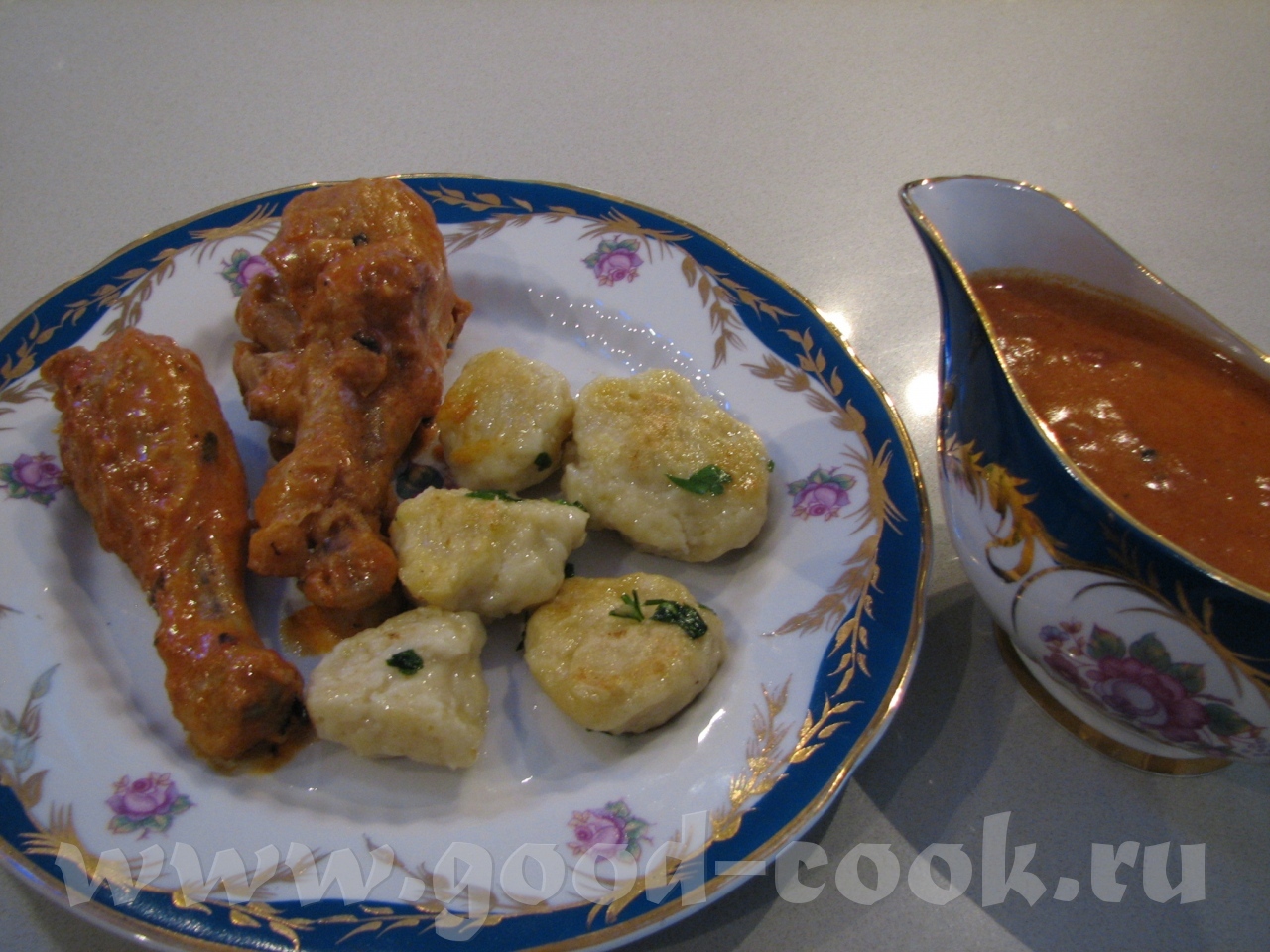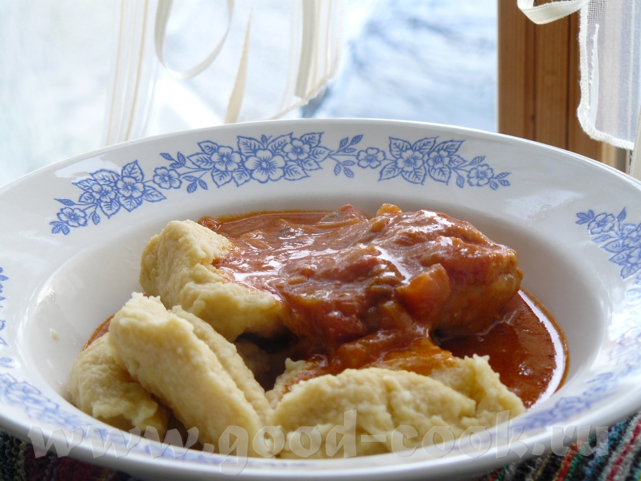 КУРИНЫЙ ПАПРИКАШ Olga Kolozy 1/4 ч растительного масла 1 курица, разрезать на 6-8 частей и очистить от кожи чёрный перец 2 ст л сладкой паприки 1 перец (я брала Anaheim длинный, зелёный, сладко-острый) 2 помидора, очищенных от шкурки и семян, нарезанных 1 большая луковица, мелко нарубленная 1.5 ч куриного бульон 1/2 ч сметаны 3 ст л несолёного масла 2 ст л муки 3 слегка взбитых яйца 0.5 ч л соли 1/2 ч концентрированного молока 1.5-2 ч муки Для клёцек смешать все ингредиенты и чайной ложкой опускать в кипящую воду. После того, как всплывут, готовить ещё 5 минут. Выложить на тарелку и сохранять тёплыми. Разница в кол-ве муки зависит от того, насколько нежными Вы хотите получить клёцки. Посолить и поперчить курицу. Насыпать 1/2 ч муки на тарелку и обвалять в ней курицу, стряхнуть излишки. Нагреть масло в чугунном котле и поджарить курицу (4 минуты на каждую сторону). Вынуть. Добавить в котёл паприку, перец, помидоры и лук; готовить до мягкости лука - 5 минут. Добавить курицу и бульон, довести до кипения. Снизить огонь и гоотвить под крышкой до полной готовности курицы (20-30 минут). В большой миске смешать 2 ст л муки и сметану. Вмешать 1/4 ч соуса из котла. Ввести сметанную смесь в котёл. Снять с огня. На сковородке нагреть масло, добавить клёцки и петрушку, прогреть. Если нет желания возиться с клёцками, то ничуть не менее вкусно ето блюдо с толстой лапшой или макаронами. |