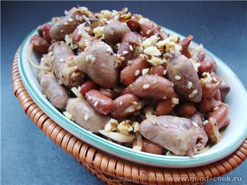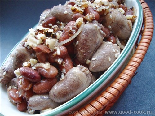 Салат из куриных сердечек с фасолью и грецкими орехами ![]() 500 грамм куриных сердечек 400 грамм - банка консервированой красной фасоли 2 луковицы 100 грамм грецкого ореха соль смесь 5 перцев 3 столовые ложки растительного масла 2 столовые ложки соевого соуса Отварить в подсоленой воде куриные сердечки ( 20-25 минут). На сковороду влить 1 столовую ложку растительного масла и 2 столовые ложки соевого соуса. Прожарить сердечки, но не дать всей жидкости выкипеть Фасоль в банке промыть, чтобы была без жидкости. Лук нарезать полукольцами и обжарить в растительном масле. Сложить в чашку сердечки, фасоль и лук вместе с маслом, в котором жарился. Добавить соевый соус, перец и мелко нарезаный грецкий орех. Перемешать и дать настояться в холодильнике или можно подать сразу. ![]() Совет: Чтобы придать сердечкам красивый вид в блюде надо после того как отварили сердечки, остудить их и отрезать жилку и жир. |