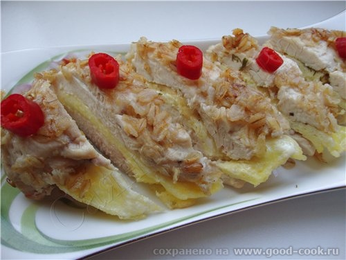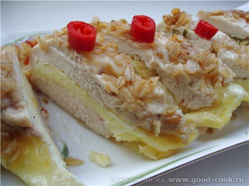 Филе курицы в панировке из овсяных хлопьев ![]() филе куриных грудок сыр твердых сортов 1 яйцо соль смесь перцев сухая паприка овсяные хлопья Яйцо взбить с солью и испечь блинчиком с обеих сторон. Выложить на тарелку, разрезать пополам. Филе курицы разрезать поперек и развернуть и подсолить. Я не стала отбивать филе, оно и так не толстое получилось. На половину филе положить половину омлета-блинчика. Сверху посыпать сухой паприкой и смесью перцев. Натереть поверх блинчика на крупной терке сыр. Закрыть половинкой филе. Берем начиненное филе курицы и с обеих сторон обваливаем в овсяных хлопьях. Положить на горячую сковороду и обжаривать с двух сторон, переворачивая. ![]() анекдот: Цыпленок бьется головой о стену и кричит: - Позор! Какой позор! Подходит курица - Мама, это правда, что у меня отец - петух? - Да, сынок. - Позор! Боже, какой позор! |