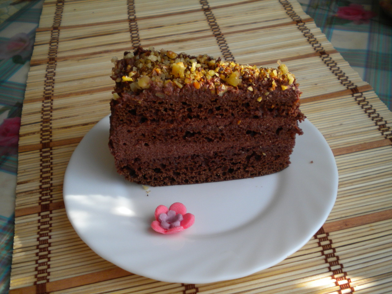 Инна,и сама не ожидала,что такой получится.Бисквит на кефире.самый простой,но я не стала смазывать маслом кастрюльку,а постелила бумагу для выпечки.Он так высоко поднялся и по структуре напоминает шоколад на кипятке.В тесто немного вишневой эссенции капнула.Пропитала коржи вишневым ликером.Крем д.Откер. шоколадный,срок годности кончался,надо было использовать.Так он у меня жидким получился,добавила масло,так масло отошло крупинками,крем все равно жидкий.Так я туда желатина добавила,подумала,что хуже уже не будет.Еще и коржи муж неровно разрезал.Кашмар!!!Сложила я все коржи в кастрюльку мультиварки,пролила кремом,засыпала орехами и отправила на ночь в холодильник.Спасибо Иришке Морганеза эту идею!Утром кастрюльку-в теплую воду,тортик вытащила.Основная часть крема впиталась в коржи,но получилось нежно,вкусно.Многострадальный получился тортик laugh.gif А цветочки от прошлого торта остались,утилизировала wink.gif