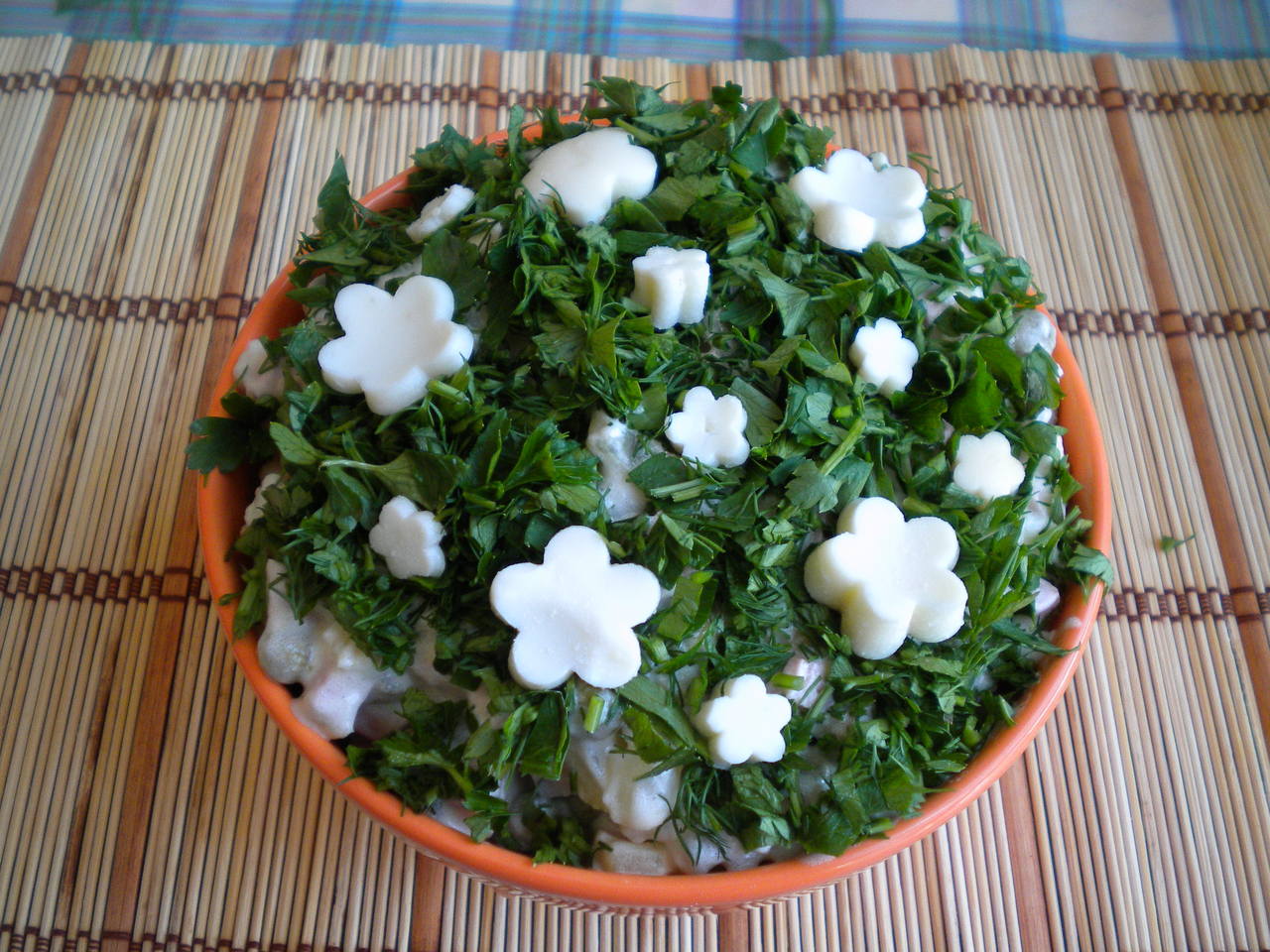 А вот еще Оливьешка.Цветочки вырубками для мастики вырезала smile.gif И майонез сама делала,получился!!!