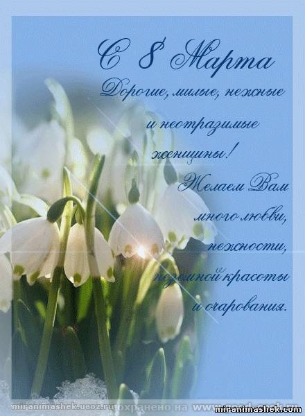 Пусть март подарит много ярких дней И будут все они неповторимы, Пусть все мечты исполнятся скорей, А рядом будет близкий и любимый. От этого весеннего тепла Все станет удивительней, прекрасней! Удачи, вдохновения, добра И солнечного, искреннего счастья! |