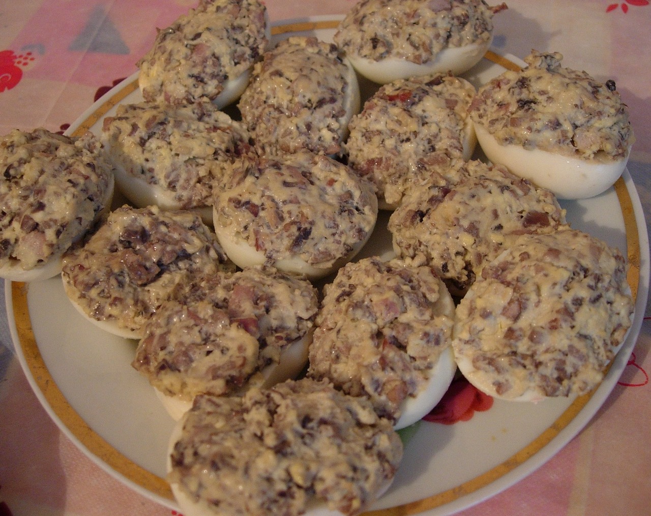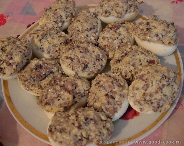 я вам к обеду фаршированных яиц принесла (желток, ветчина, грибы, сметана)