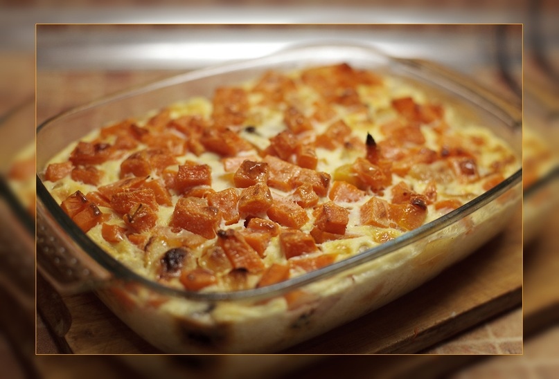 все перемешать, можно слоями тыква-яблоки+сухофрукты-тыква)